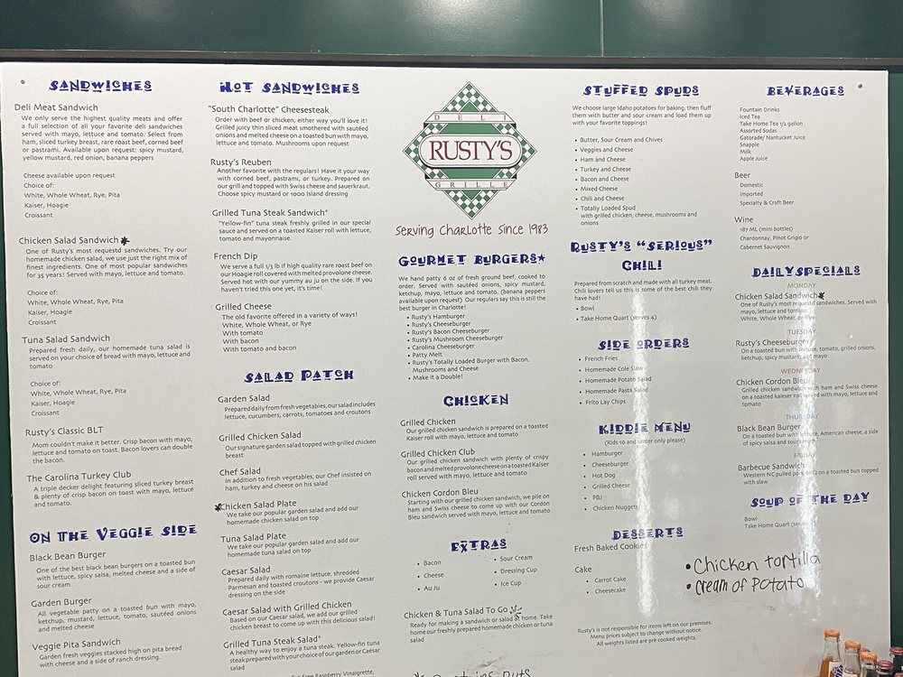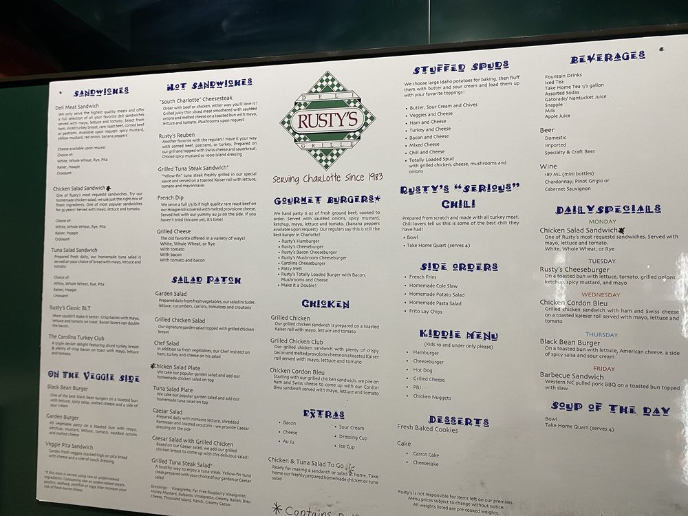 Introducing Rusty's Deli & Grille, a cozy American deli located in Charlotte, NC. Known for their signature sandwiches like the Carolina Turkey Club, Rusty's Classic BLT, Chicken Salad Sandwich, and Tuna Salad Sandwich, this spot has been a favorite for over 30 years. Customer reviews rave about the amazing food and friendly service, with favorites including the Reuben, bacon cheeseburger, and loaded potatoes. The South Charlotte cheesesteak and mushroom Swiss burger are also highlights. The menu offers a broad range of options, with weekday specials available. The ambiance is cozy, the staff is accommodating, and the food is made fresh to order, ensuring a delightful dining experience. Whether you're a longtime fan or a first-time visitor, Rusty's Deli & Grille is a must-try destination for delicious deli fare.